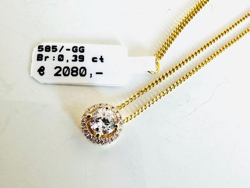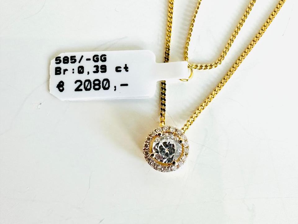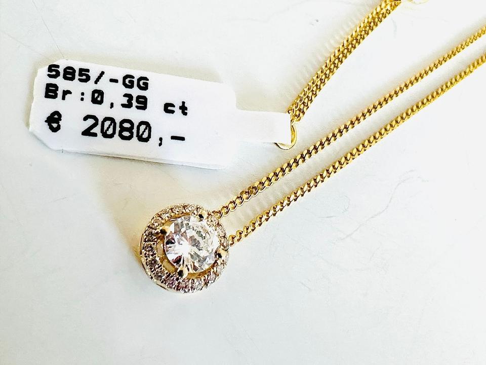 Brilliantanhänger mit Kette 585/- Brillianten 0,39 ct Mittelstein 0,32 ct W/lupenrein Anhänger mit Kette Kettenlänge 42 cm Kettenlänge kann geändert werden Durchmesser 7,2 mm Juwelierpreis 2080,- Angebot 1260,- Das ist ein Festpreis, Versan…