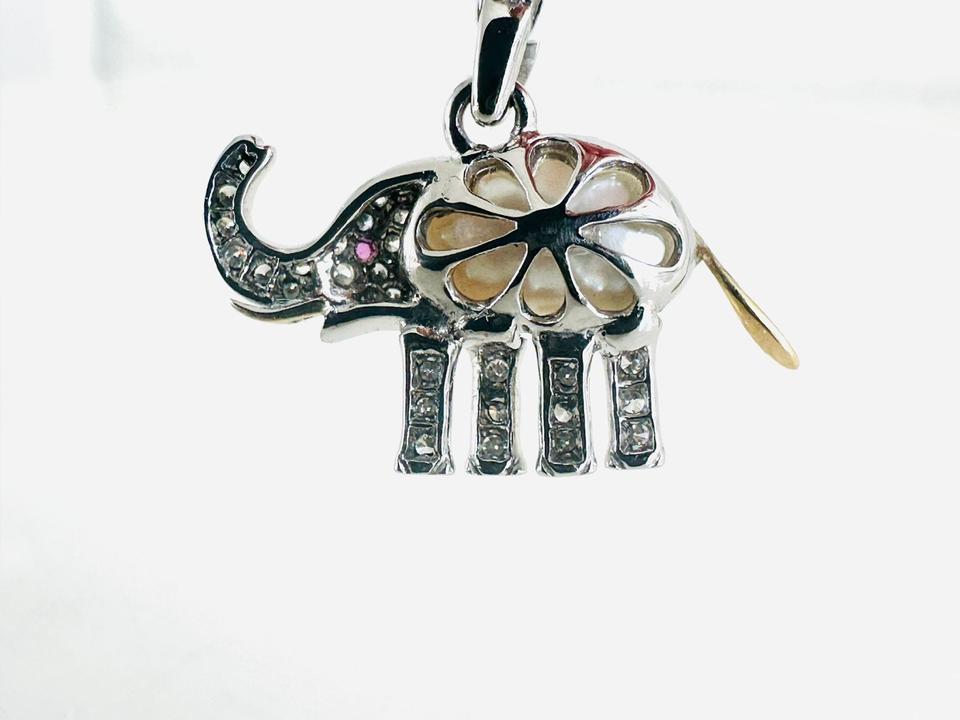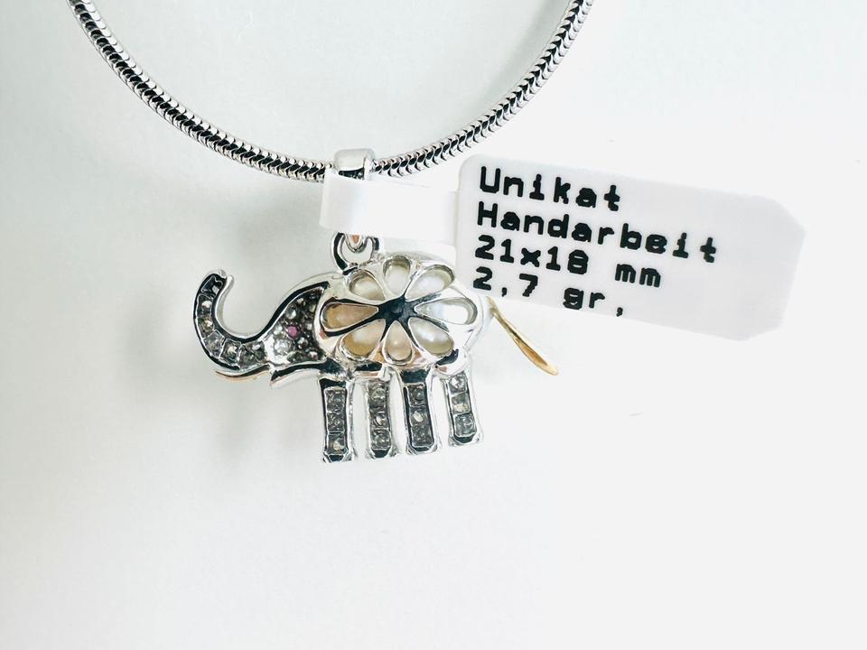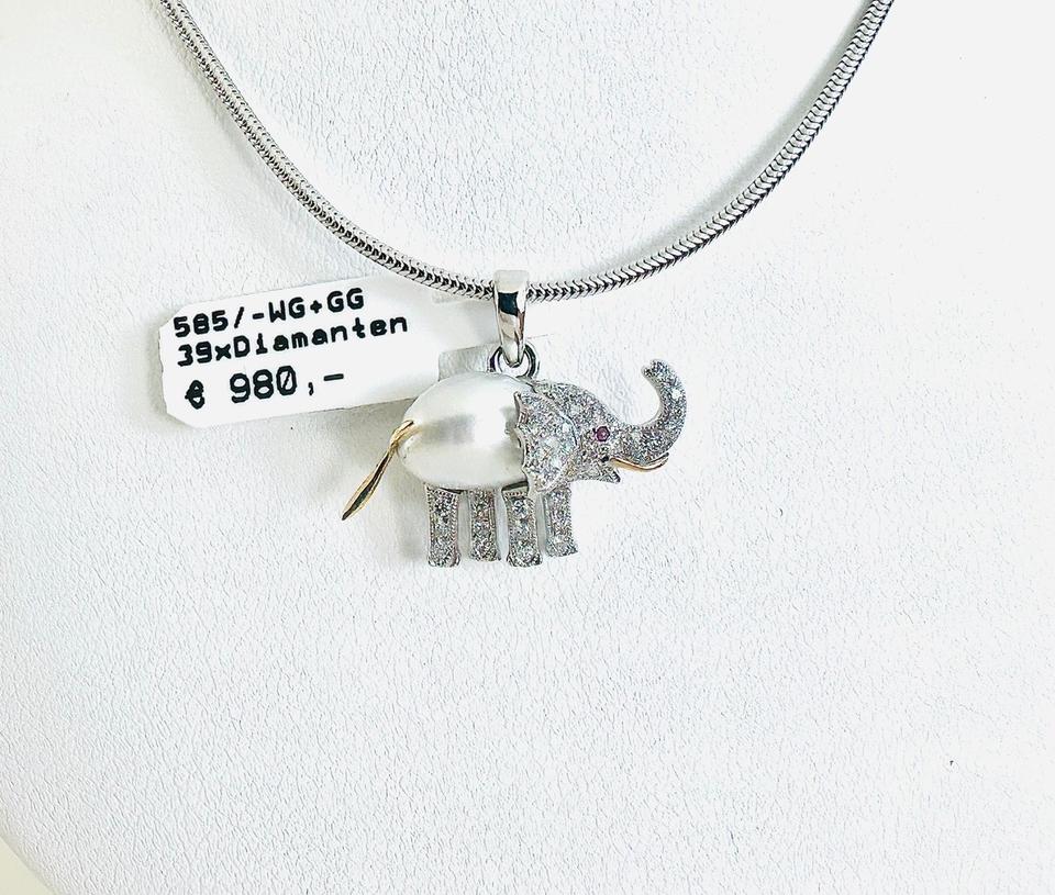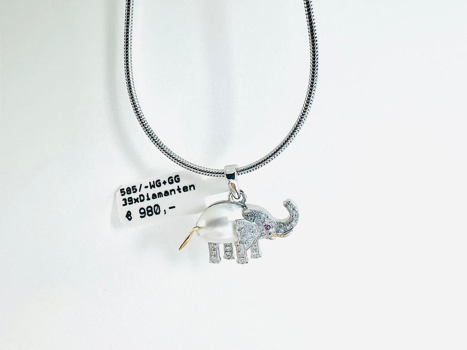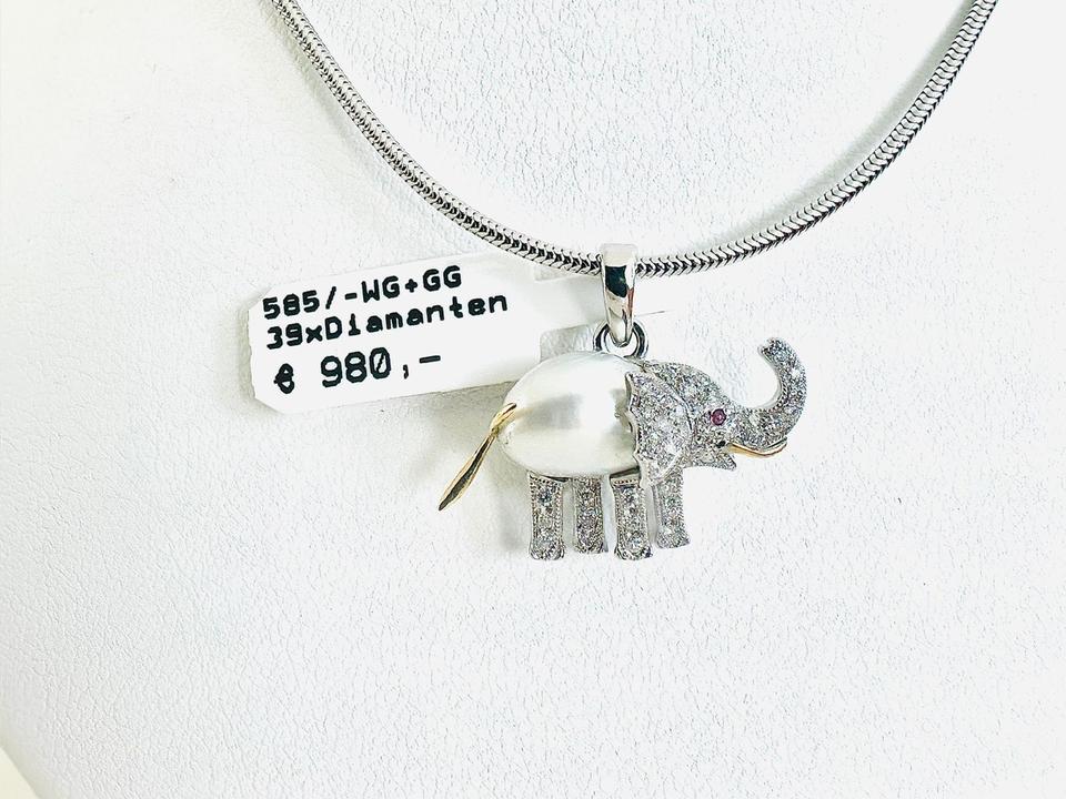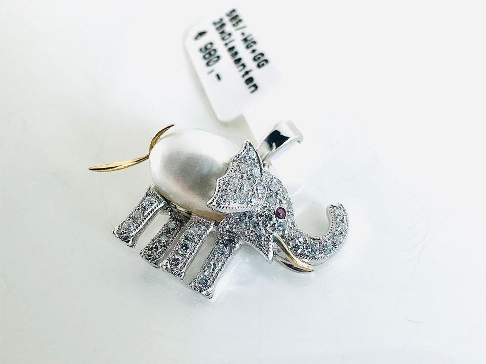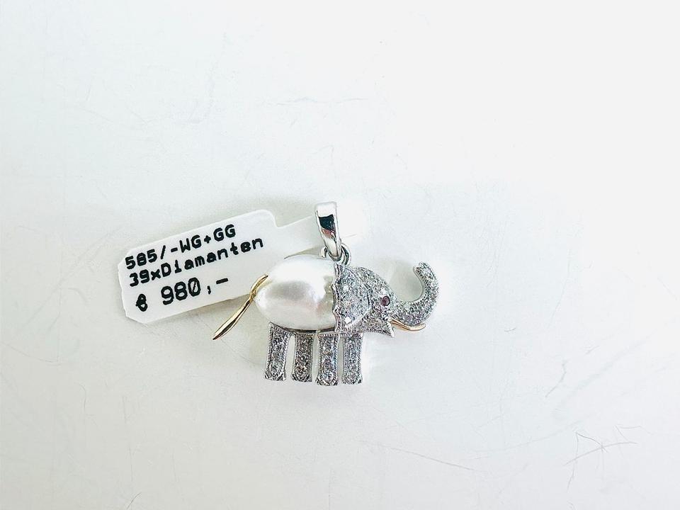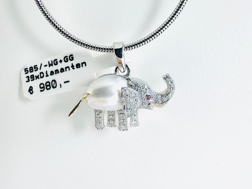 Elefant- Anhänger 585/- Gold/Weißgold mit 39 Diamanten Zuchtperle und Rubin Unikat Handarbeit 21×18 mm Gewicht 2,7 Gramm Juwelierpreis 980,- Angebot 580,- Das ist ein Festpreis, Versand gegen Vorkasse möglich