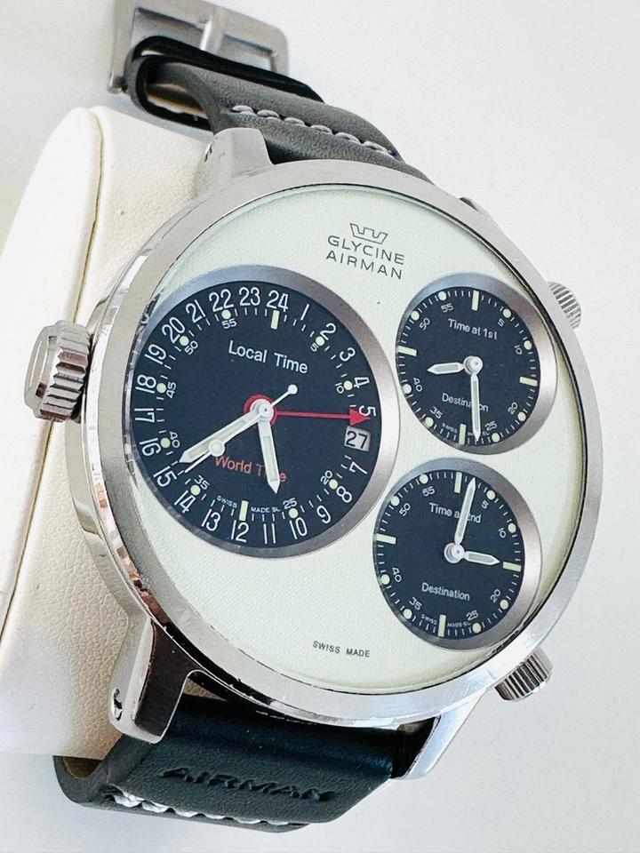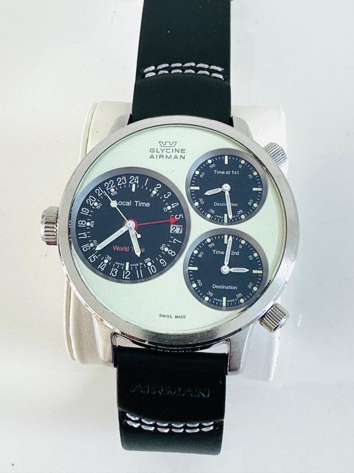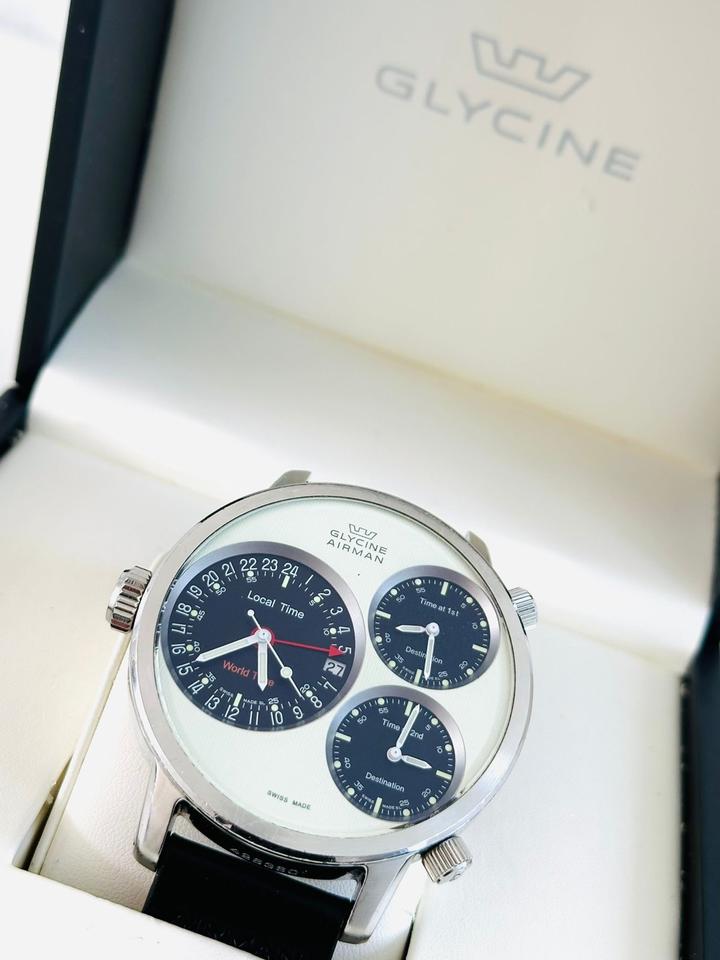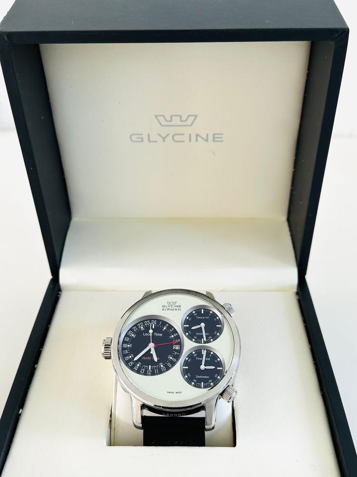 Glycine Airman 4 Zeitzonen GMT mit Original Box Ref 3841 Durchmesser 53 mm 3 Automatic Eta Uhrwerke Krone links Angebot 1750,- Das ist ein Festpreis, Versand gegen Vorkasse möglich. 1 Jahr Garantie