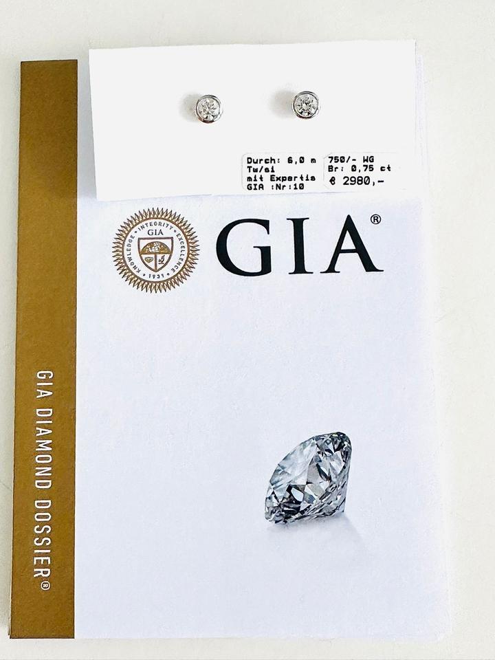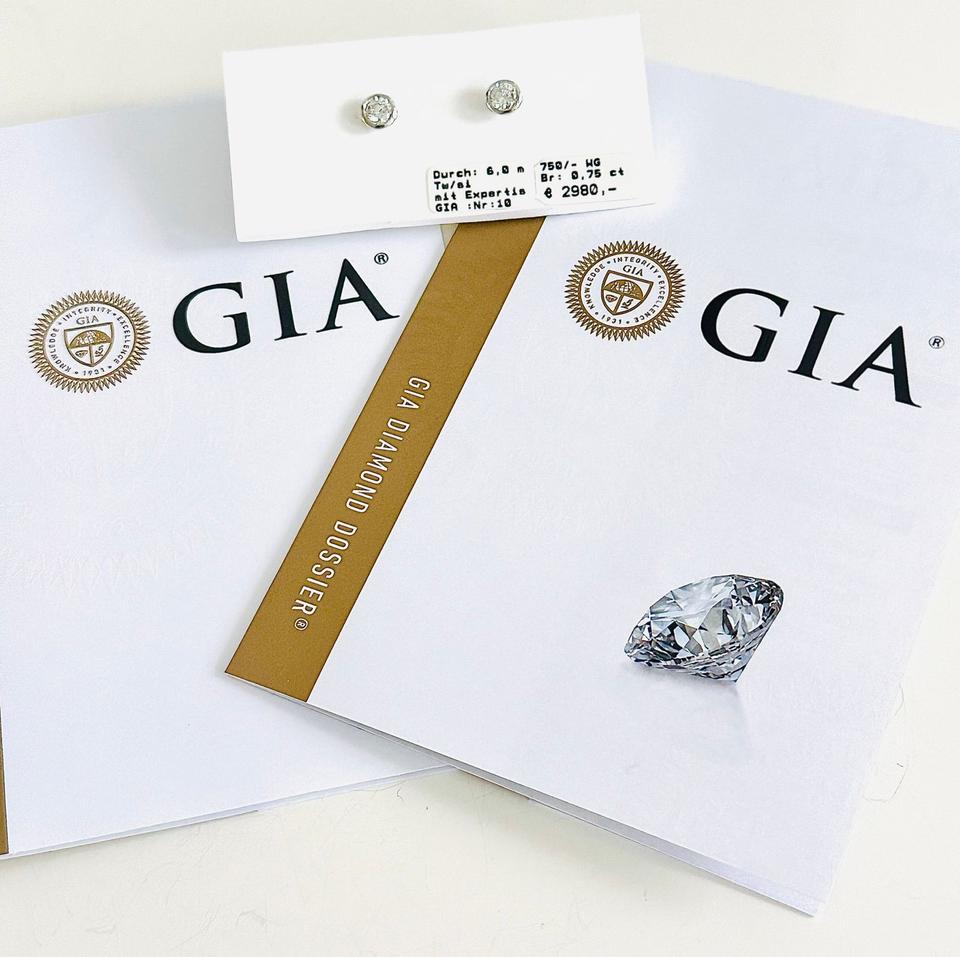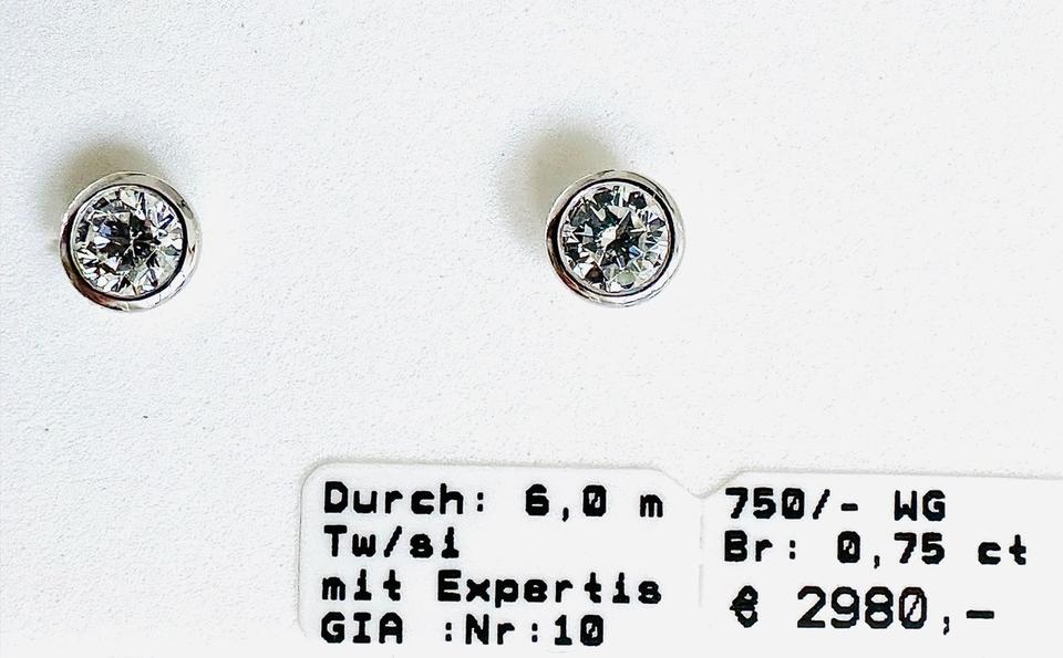 Ohrringe 750/- Weißgold mit Brillianten 0,75 ct Tw/si mit Expertise GIA Durchmesser 6 mm Juwelierpreis 2980,- Angebot 1940,- Das ist ein Festpreis. Versand gegen Vorkasse möglich
