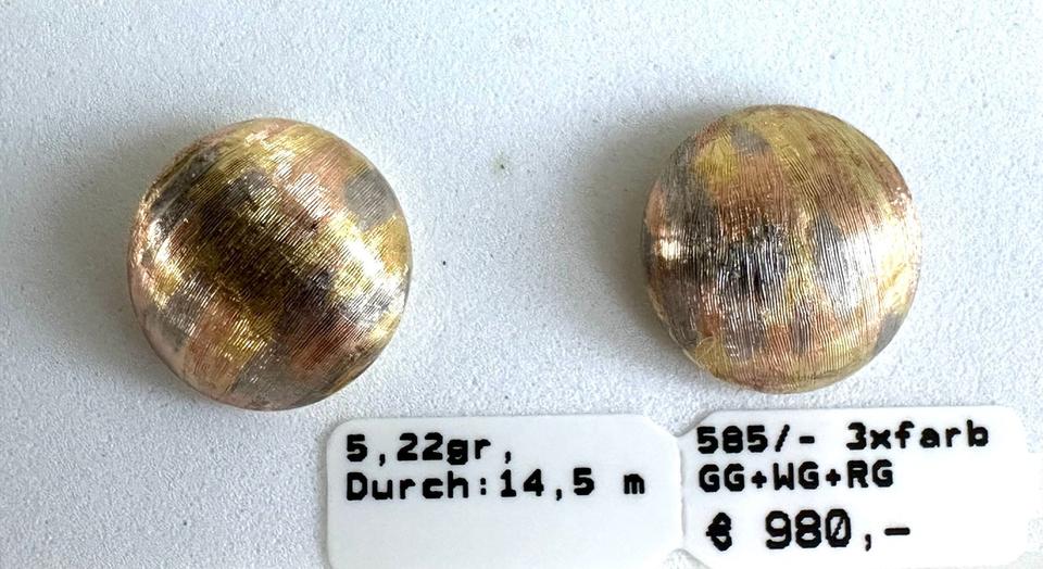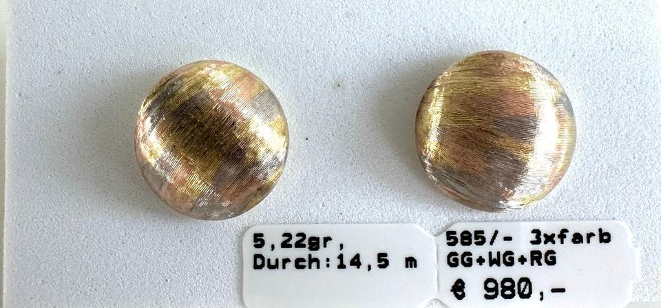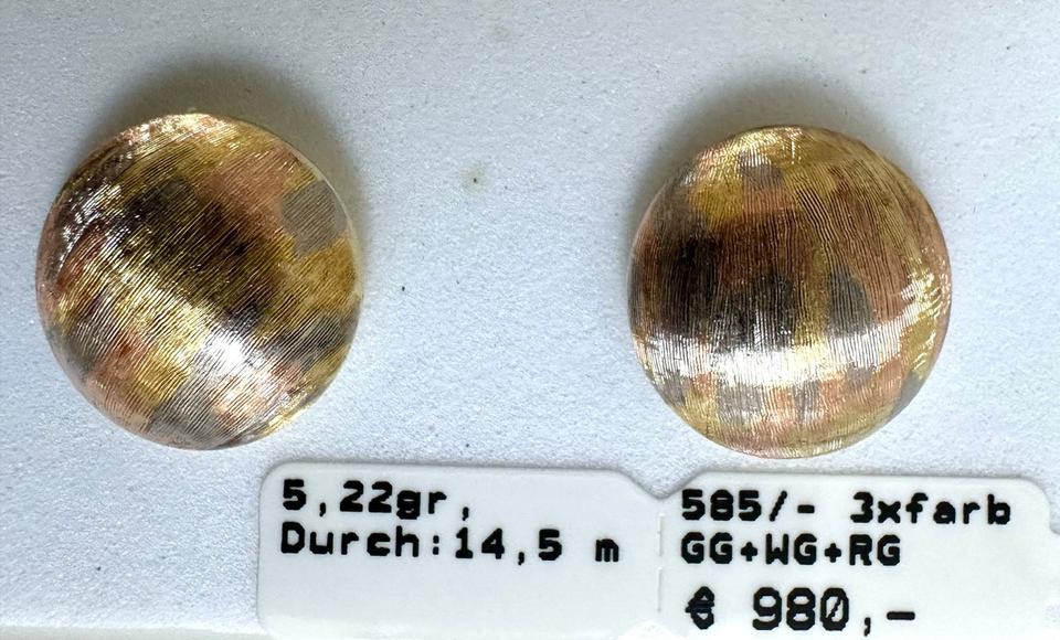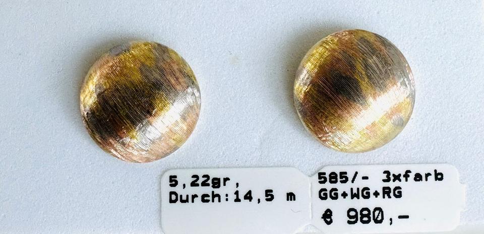 Ohrstecker 585/- Gold , Dreifarbig Durchmesser 14,5 mm Gewicht 5,22 Gramm Juwelier Verkaufspreis 980,- Angebot 590,- Das ist ein Festpreis, Versand gegen Vorkasse möglich