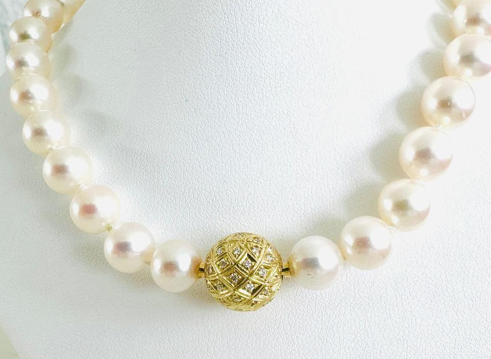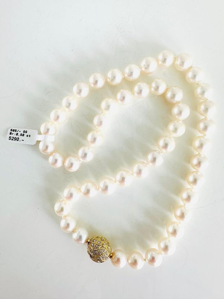 Akoyazuchtperlenkette 585/- Gold mit Schließe mit Brillianten 0,50 ct Perlendurchmesser 8,5 mm Schlossdurchmesser 12 mm 45 cm Länge Juwelierpreis 5290,- Angebot 3260,- Das ist ein Festpreis, Versand gegen Vorkasse möglich.