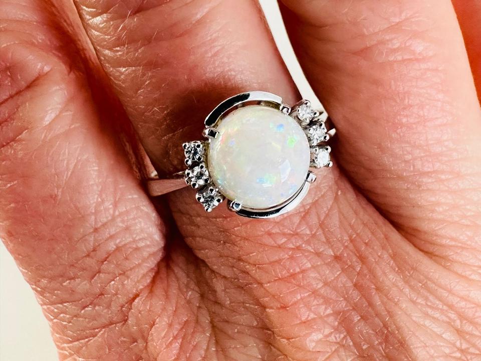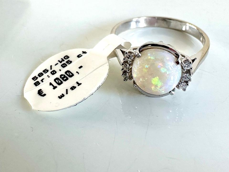 Ring 585/- Weißgold mit Opal und Brillianten 0,05 ct w/si Ringweite 63 Ringweite kann ggf von uns geändert werden. Opal Durchmesser 8,5 mm Juwelierpreis 1080,- Angebot 650,- Das ist ein Festpreis, Versand gegen Vorkasse möglich.